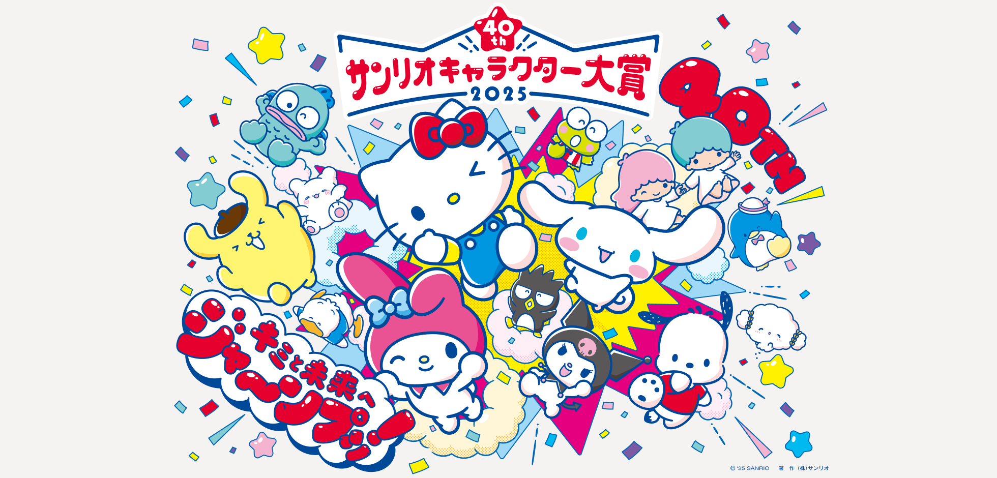 450を超えるサンリオキャラクターの中から選ばれたキャラクターがエントリーし、 WEBやサンリオショップなどからの投票数により順位を決定します。今年のテーマは「キミと未来へジャ〜ンプッ!」。40周年という節目の年を迎えたサンリオキャラクター大賞は、 1986年「いちご新聞」のはがき投票から始まり、世界中から愛されるイベントへと成長してきました。この先の未来も、ファンの皆様とともにさらに大きく「ジャ~ンプッ!」し、サンリオから世界中に笑顔と幸せの輪を広げていきます。キービジュアルでは、キャラクターたちが未来へ向かって力強くジャンプする姿を描き、前向きでエネルギッシュなデザインにしました。